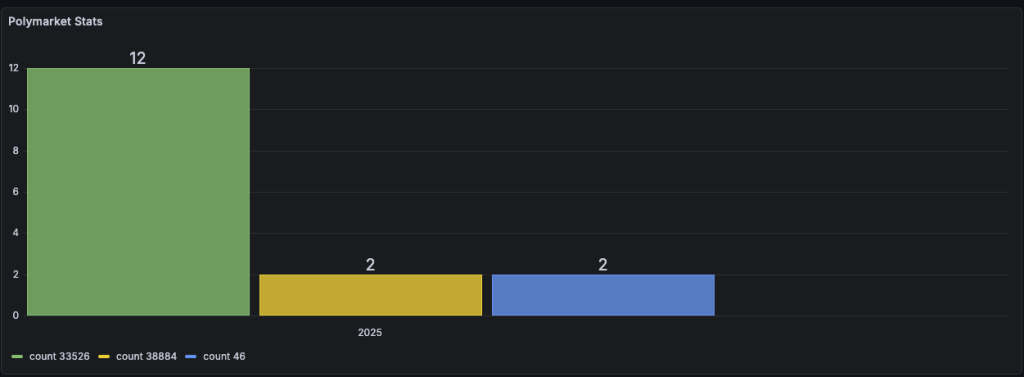 Rather than a separate JSON file, this project includes the dashboard inside dashboard-configmap.yaml as a ConfigMap. The dashboard-configmap.yaml contains a single configured panel titled “Polymarket Dashbaord” (a barchart) that uses a raw SQL time-series target. The panel’s query looks like this: