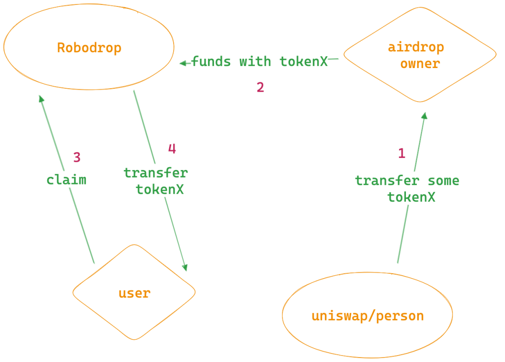 - Robodrop owner funds the Robodrop contract with UselessTokens (upon creation) that it’s allowed to spend as airdrops.